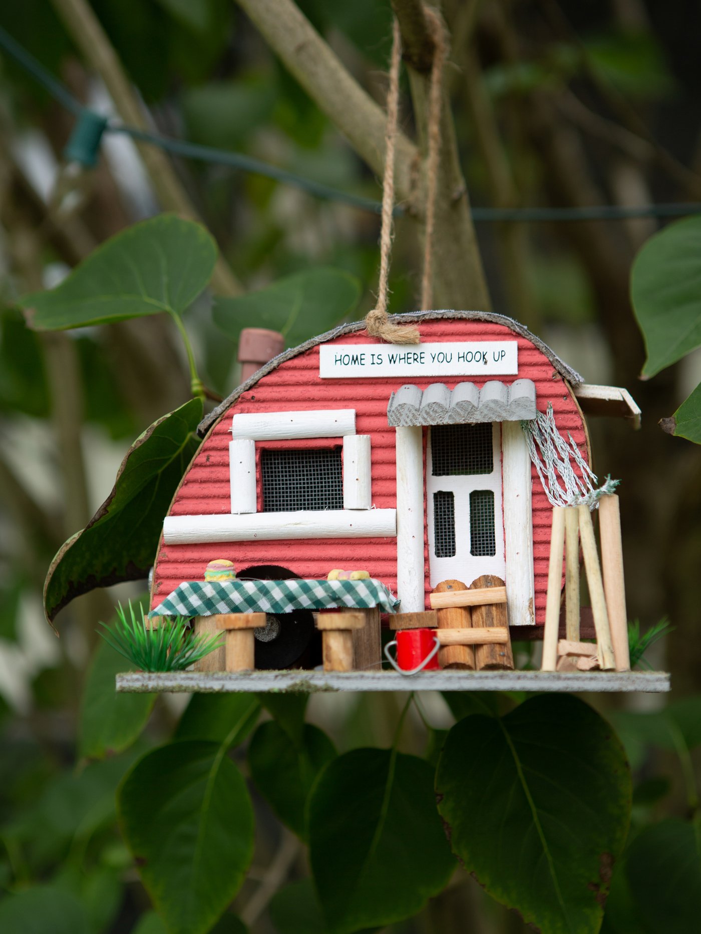 • Create a comfy campground for your fly-in guests with this cozy little trailer! Comical birdhouse comes complete with all the accessories of an old-time outdoor paradise.