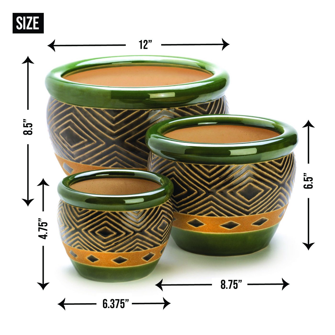 • Lush shades of sand and jade add natural elegance to your favorite plants, showing them off to stunning effect! Coordinating pots in three separate sizes create an effortless designer look. The bottom of each planter features a small drain hole to ensure your plant stays happy and healthy.