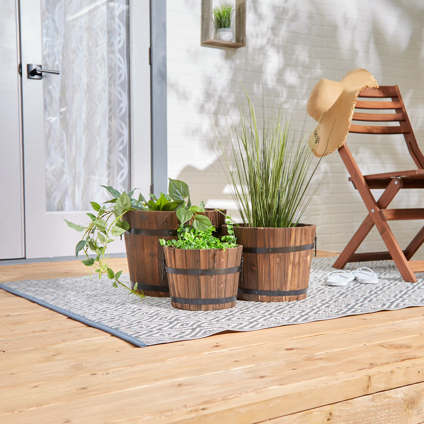 • This trio of planters have a look of aged oak barrels, complete with black metal banding and handles for ease of relocating around your yard as the mood or sun strikes. Each planter has a different size to allow you to make these the charming homes for a variety of plants.
