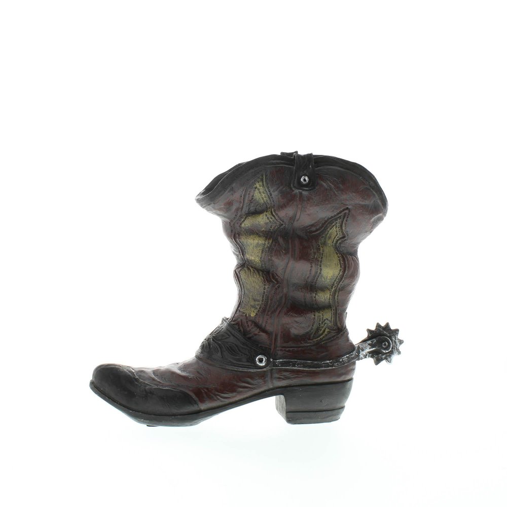 • Let your favorite flowers or plant saddle up in this charming cowboy boot planter. This planter has plenty of Western flair and looks like a well-worn and weathered boot, complete with a spur on the back.