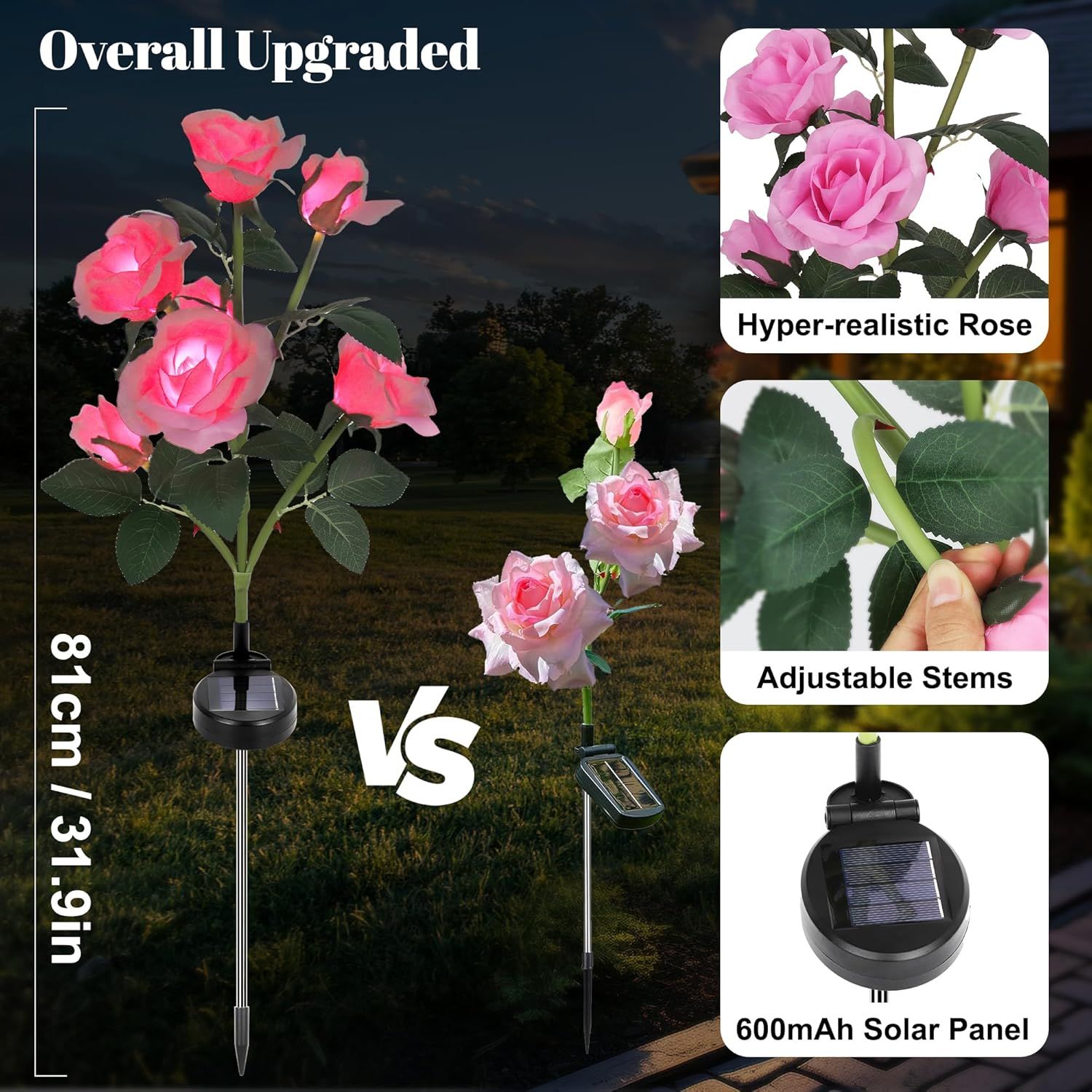 • Enchanting Solar Rose Stake Lights: 2 pack realistic solar flower lights with 14 artificial roses, Transform your outdoor space with our realistic solar rose lights, featuring lifelike petals that glow in dazzling colors. Perfect for adding a touch of elegance to gardens, pathways, or patios—day or night!